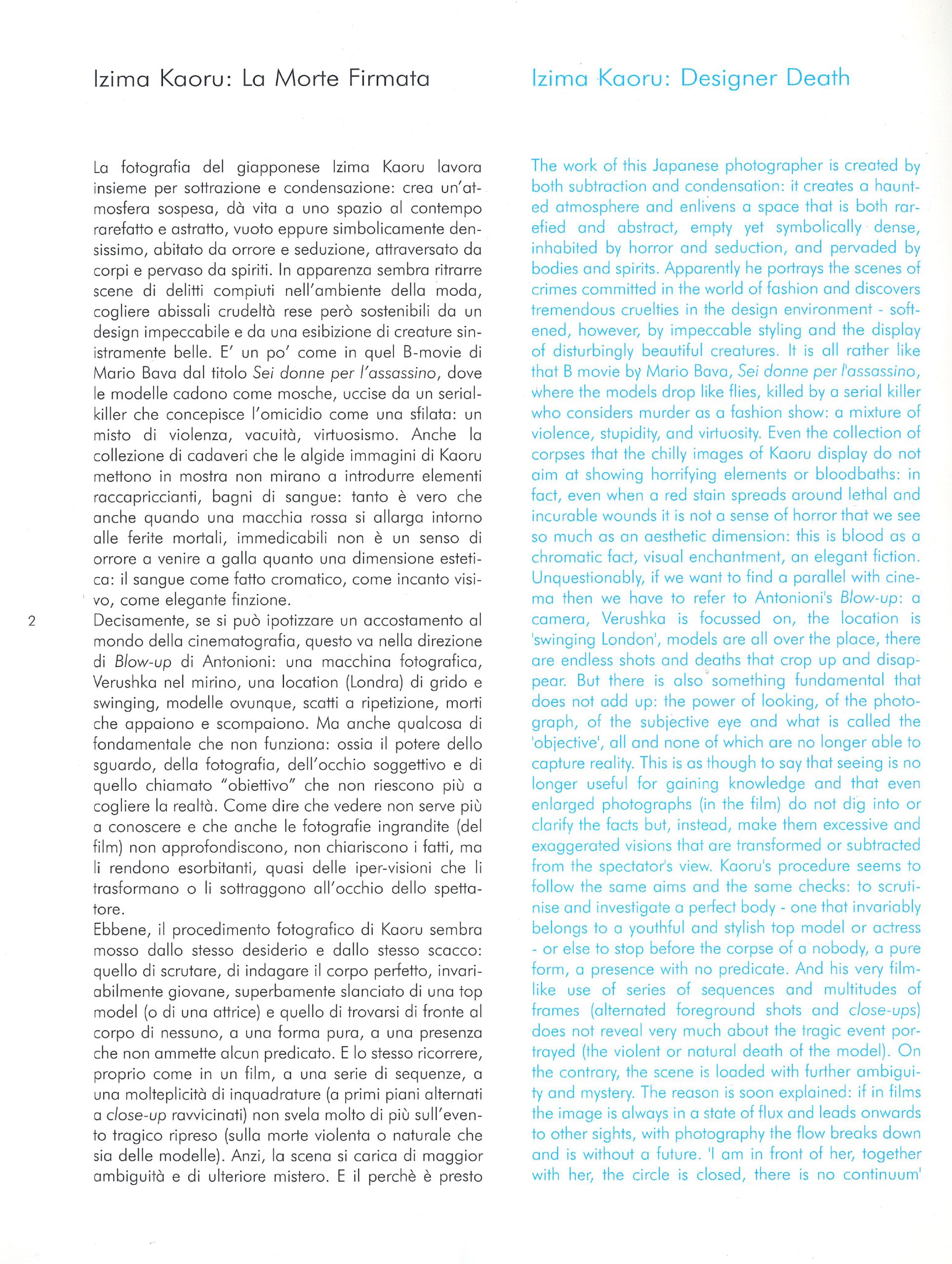 Izima Kaoru è nato nel 1954 a Kyoto, vive e lavoro a Tokyo. Kaoru ha esposto il suo lavoro artistico dalla fine degli anni ’70 in varie mostre allestite in spazi pubblici e privati internazionali. È stato reso famoso dal suo servizio fotografico “Paesaggio con cadavere”, su cui ha lavorato tra il 1993 e il 2008.