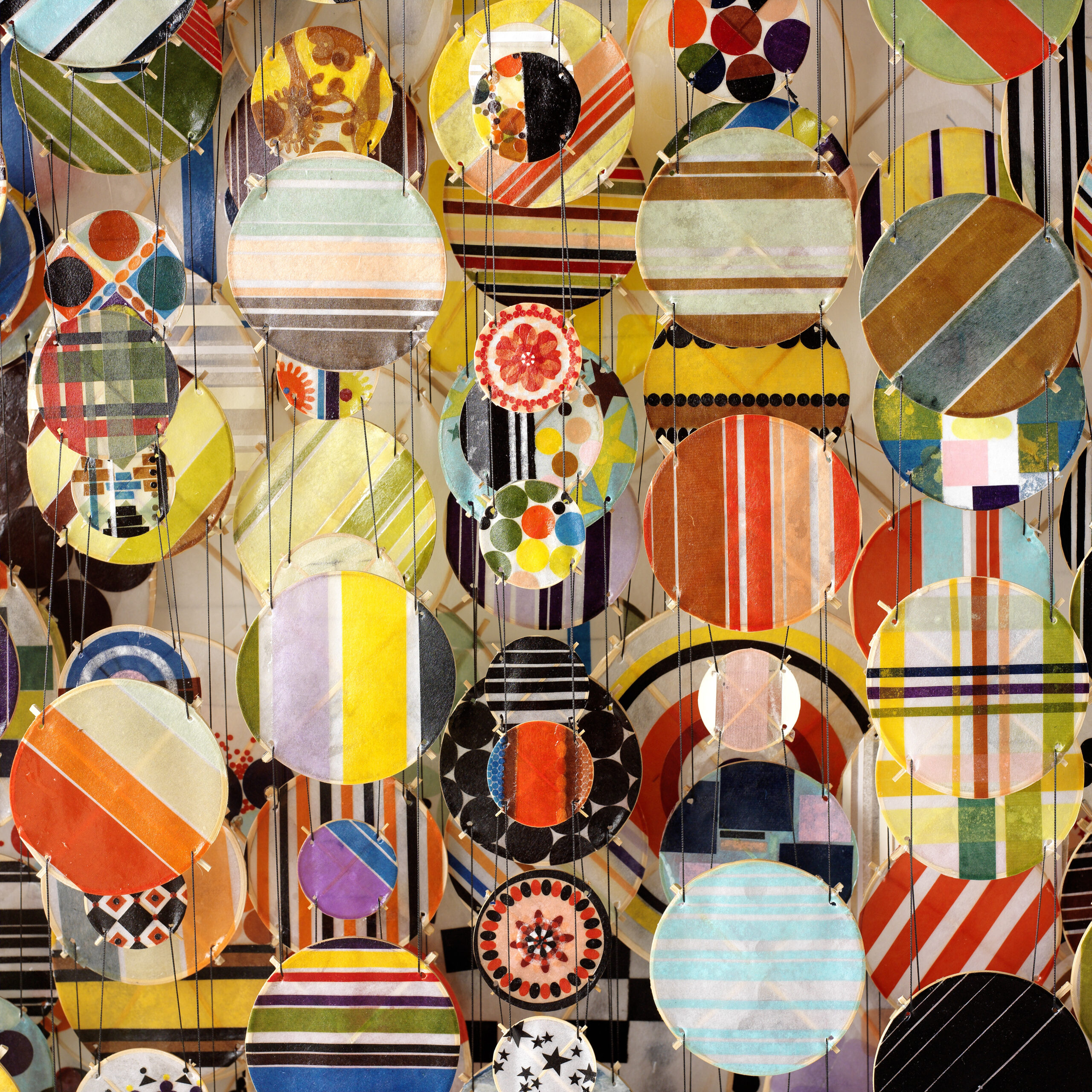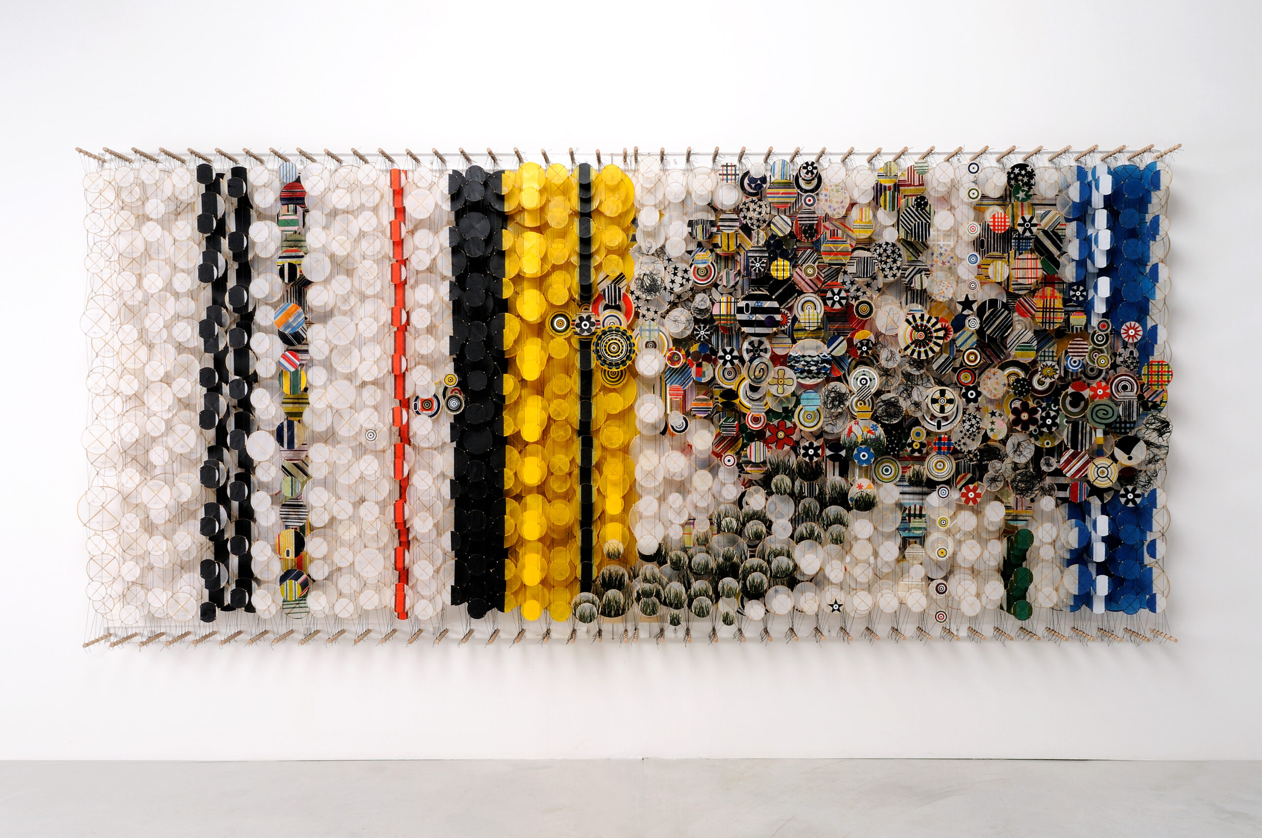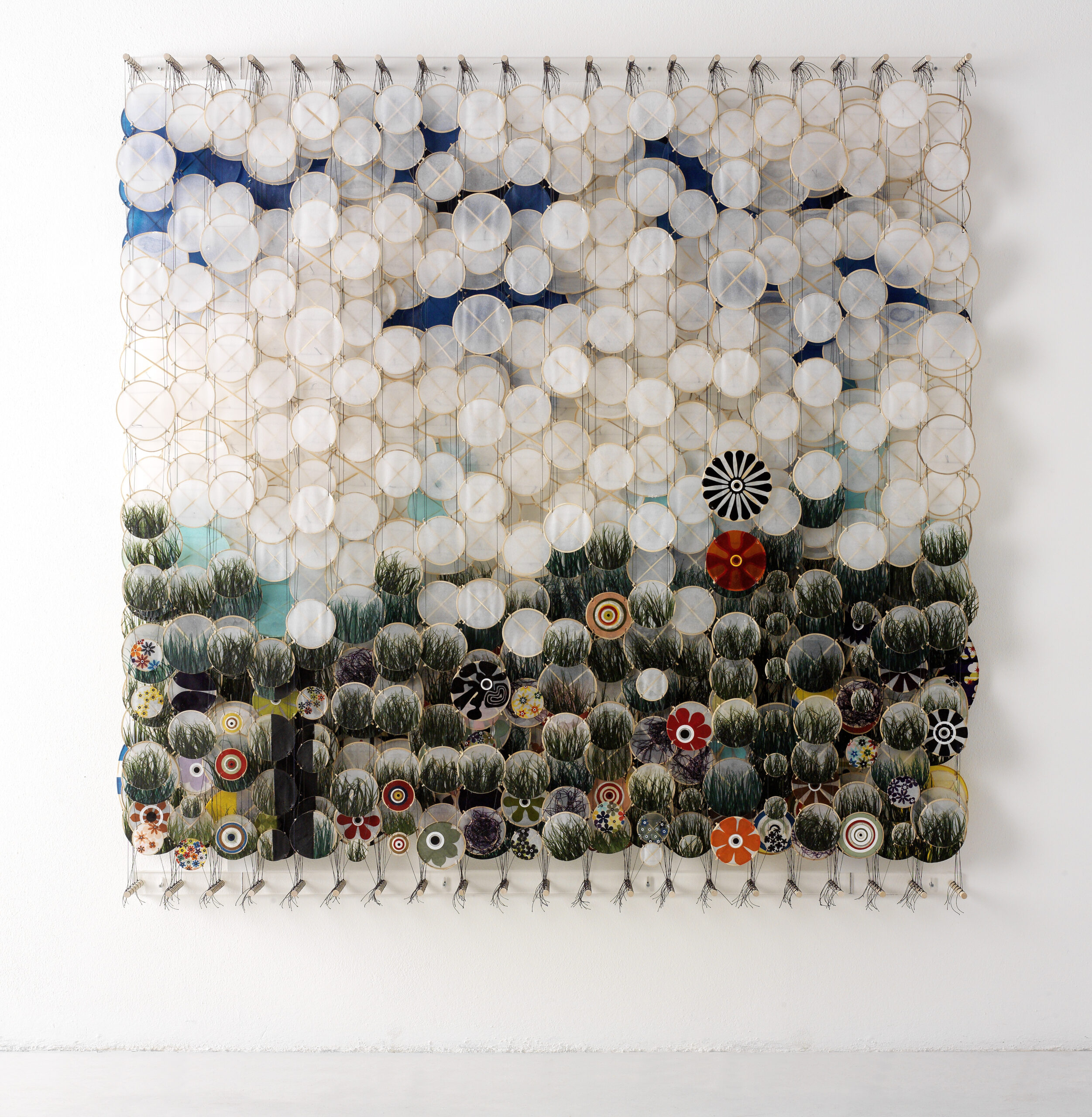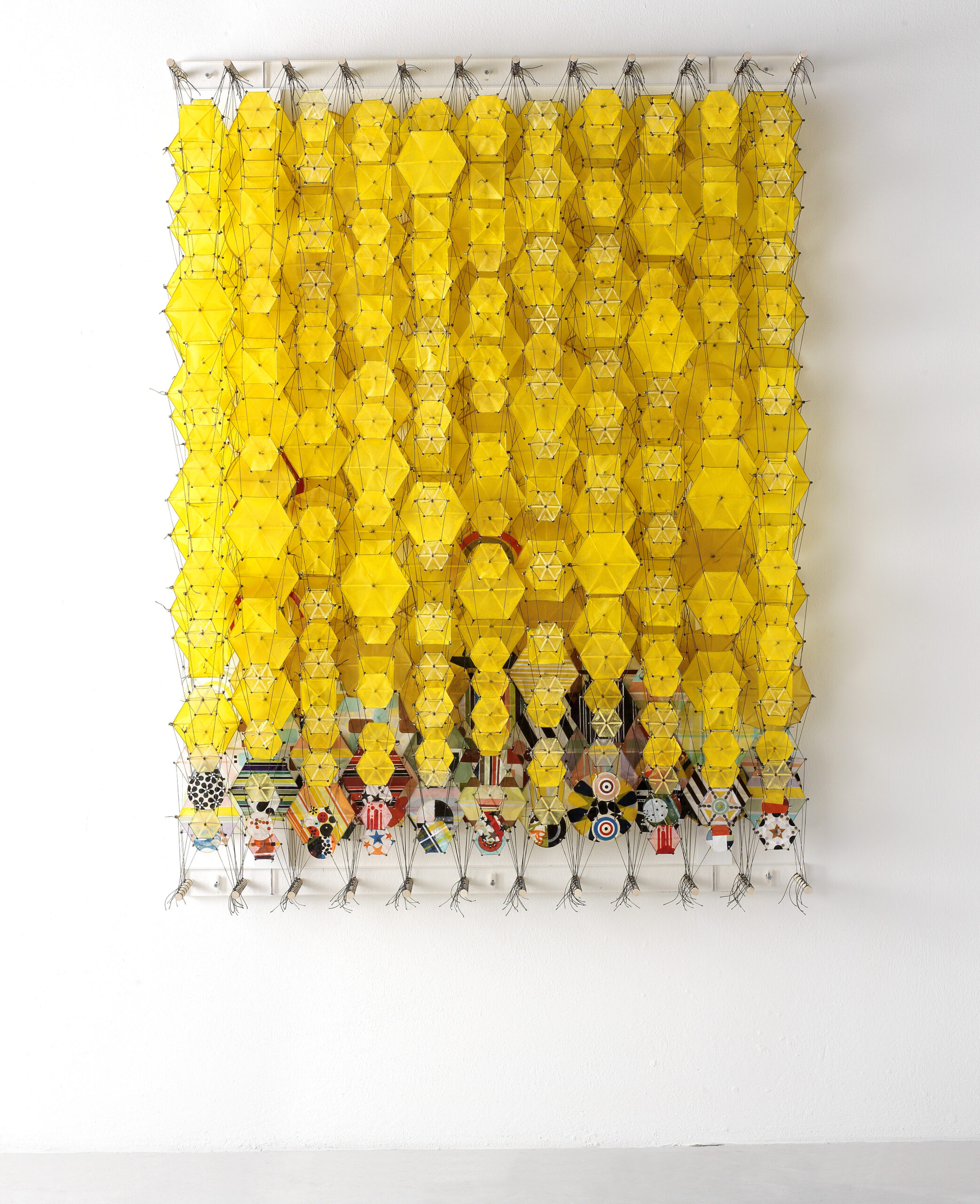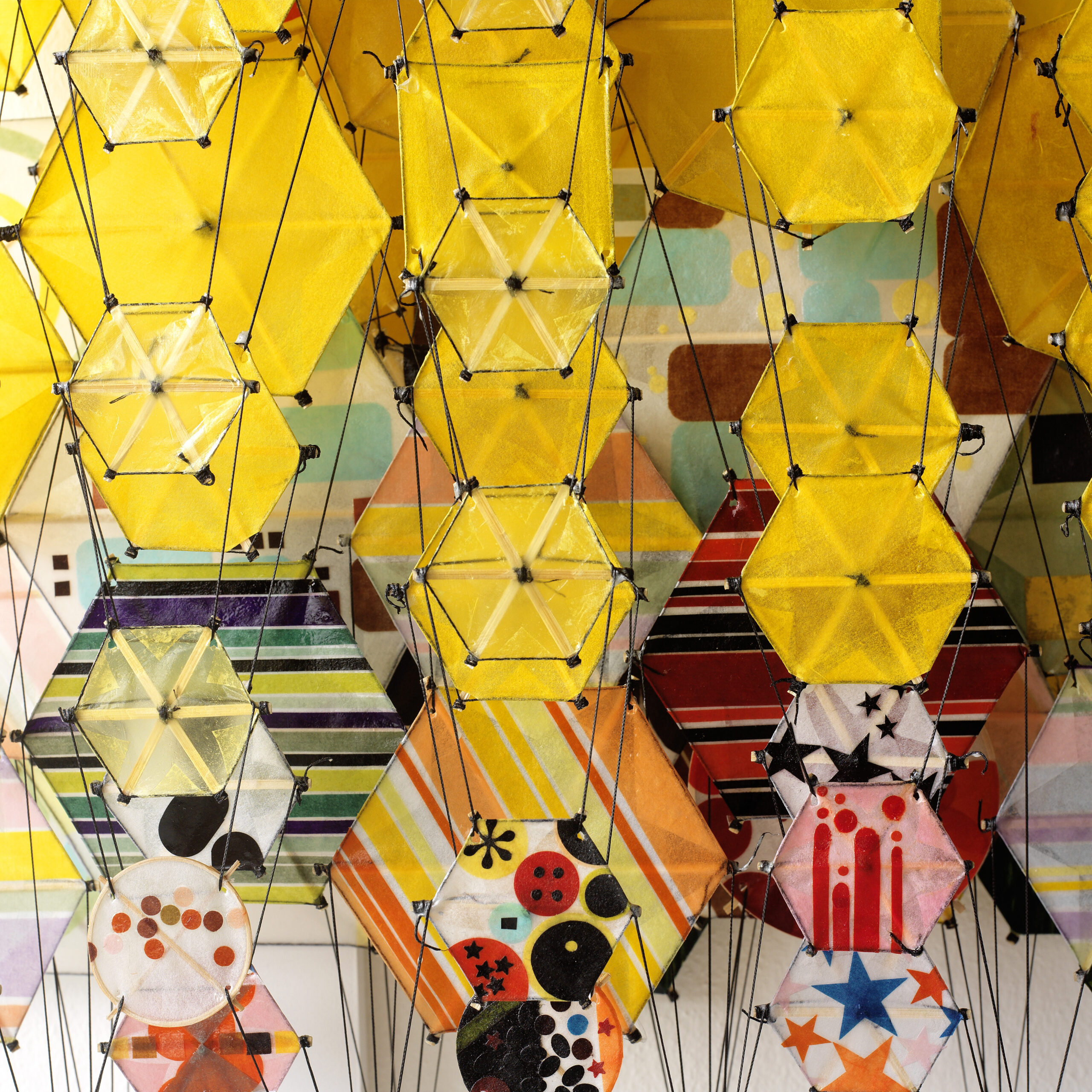 “Jacob Hashimoto V” is American artist Jacob Hashimoto’s fifth exhibition at Studio la Città since he began working with the gallery in the late 1990’s. For this exhibition Hashimoto is preparing a number of new, wall based kite installations which continue his exploration into the seemingly endless possibilities and curious juxtapositions between landscape and abstraction. Additionally, Hashimoto is designing on a room-sized environmental installation that will completely dominate back half of the gallery space. This complex installation is comprised of a number of intersecting elements, from digital sculpture to drawing to canopies of thousands of kites, all intersecting to create a sculptural environment that will wrap around the viewer in an overwhelming physical collage. This installation directly references older bodies of his work, quite literally wrapping them around and weaving them through more recent projects, creating a non-linear timeline of a vision that has taken him most of the last decade to realize. Visitors to the space will be allowed to walk under, through, and around the sculptural installation, the texture, lighting and angle of the work, shifting and changing as they travel through its lush architecture.